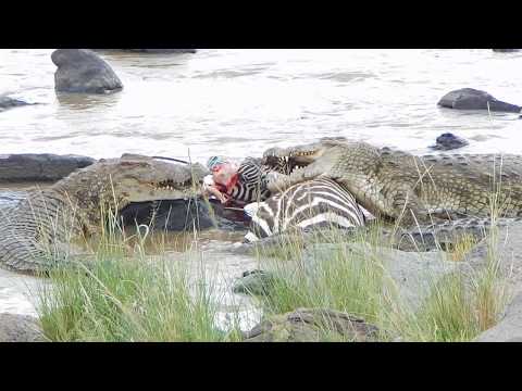 Given that it was in January, the crocodiles were very hungry and immediately they took advantage of the crossing zebras. that's when one crocodile got a hold of the zebra the others started to close in. One of the crocodile went for the face of the zebra and rolled hoping to rip the head out but instead ripped the face out. like in the movies face off. it took sometime before the zebra died. ''